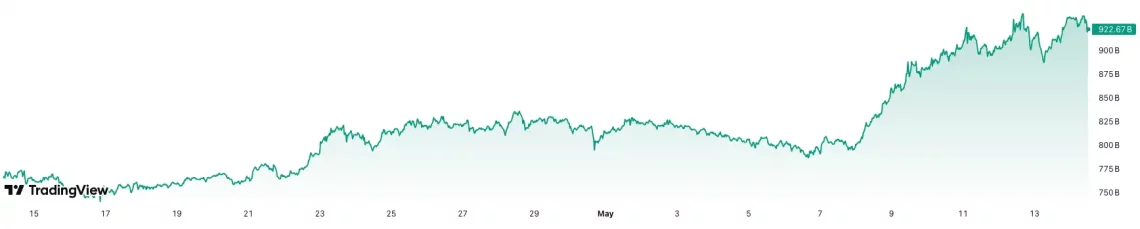 Olası bir altcoin dönemine dair ipuçları verebilecek bir başka bilgiyse BTC ve ETH hariç tutularak ölçülen kripto para piyasasının toplam bedelini gösteren TOTAL3 metriği. Son 30 günde yüzde 20 yükseliş kaydeden TOTAL3’teki temel kırılımın geçen hafta yaşandığını söylemek mümkün. 7 Mayıs’tan itibaren keskin bir yükseliş kaydeden TOTAL3 metriği haber yazım prestijiyle 922 milyar doları geçmiş durumda. Yalnızca bir hafta evvel birebir metrikte ibrenin 791 milyar doları gösterdiğini hatırlatmak gerek.