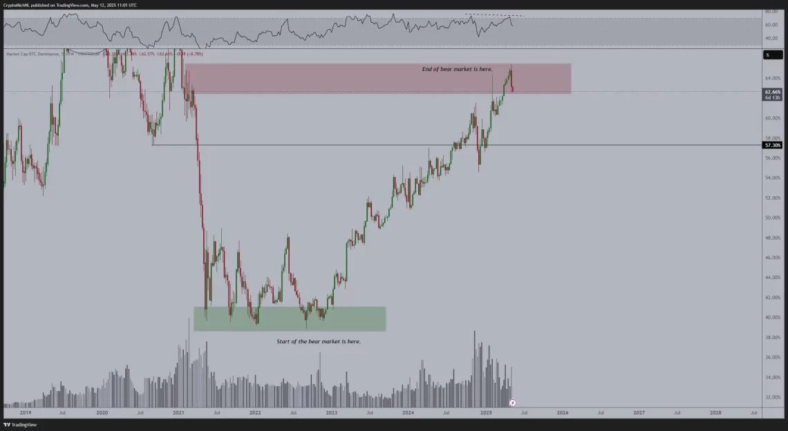 Üstelik altcoin dönemine dair kimi argümanlı görüşler kelam konusu. Kripto dalının önde gelen isimlerinden Michaël van de Poppe 12 Mayıs’ta yaptığı açıklamada aşağıdaki tabloyu paylaşarak şunları söyledi: “Haftalık vakit diliminde Bitcoin hakimiyetinin tepeye ulaştığını gösteren güçlü düşüş sapması. Altcoinler için ayı piyasasının sonu geldi.”