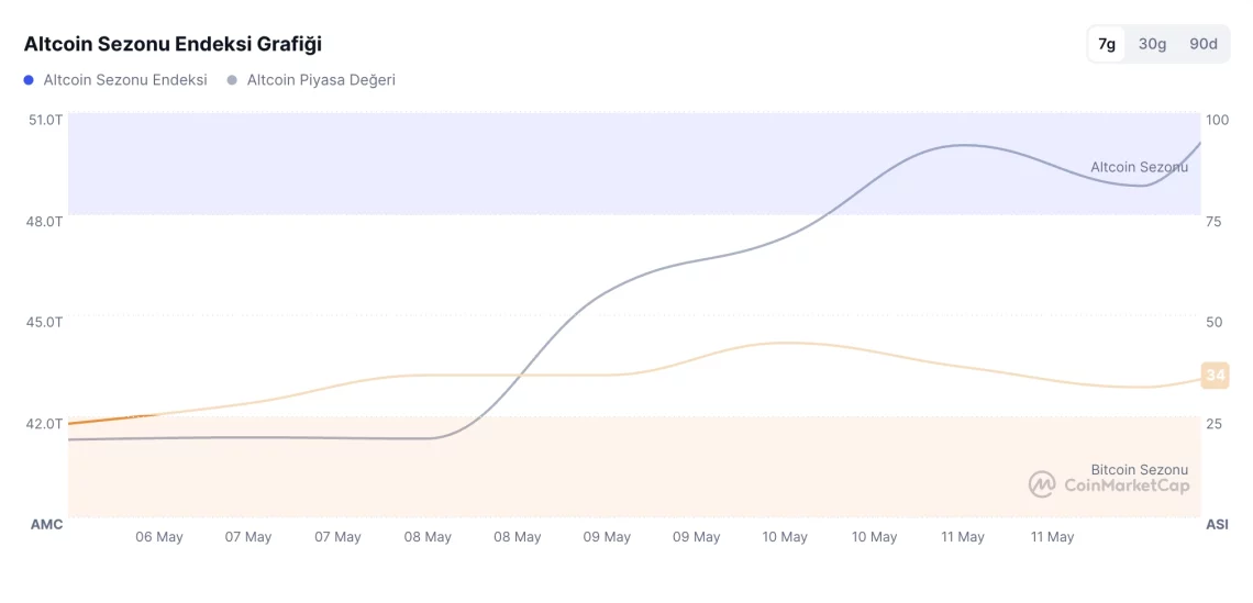 CoinMarketCap Altcoin Dönem Endeksi son yedi günde 23’ten 34’e yükseldi. Kelam konusu endeks, Bitcoin yahut altcoin’lerin muhakkak bir periyotta daha güzel performans gösterip göstermediğini takip ediyor. CMC Altcoin Dönem Endeksi, birinci 100 kripto paranın (stabil kripto paralar ve WBTC ve stETH üzere varlık takviyeli token’lar hariç) son 90 günde Bitcoin’den daha güzel performans gösterip göstermediğini ölçüyor.